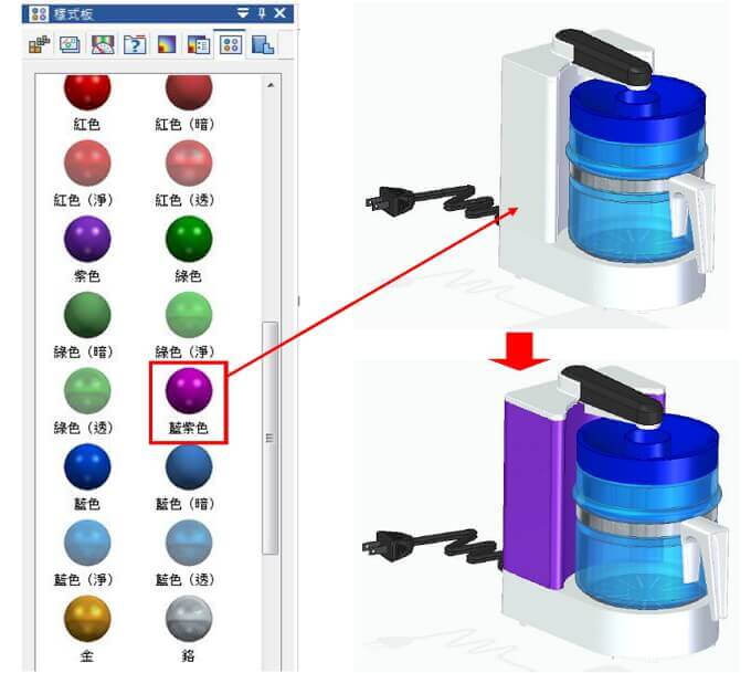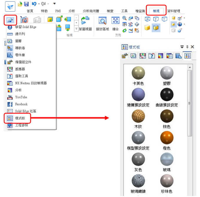 在Solid Edge 組立環境下新增樣式板功能,透過樣式板可直接拖拉色彩球到零件上。