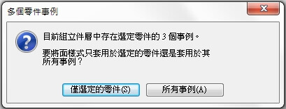 上色過程中將出現警告訊息 可選單一上色(僅選定的零件)或全部套用上色(所有事例)。