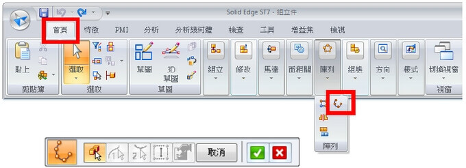 1.在組立環境中從【首頁】分頁,可找到陣列中的【沿曲線】指令。