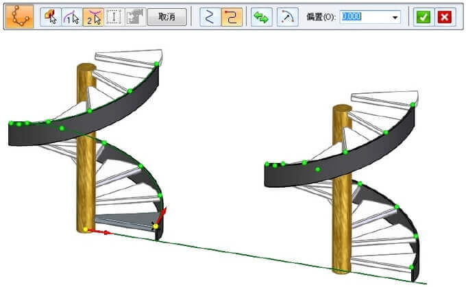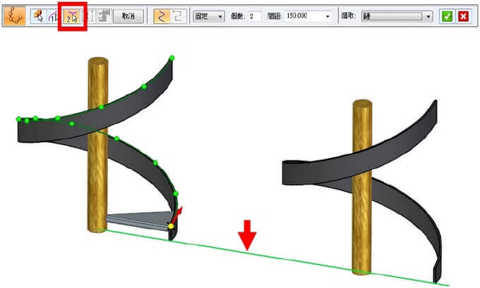 3.沿曲線陣列功能,允許同時定義『第二條路徑線』完成多個陣列。 當第一個陣列指令選擇完後,接著點選工具列中第二個路徑曲線步驟,選取第二條路徑線定義。