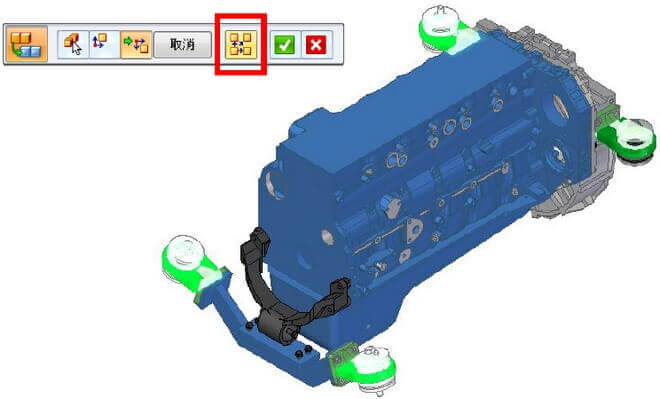 4.點擊「選取符合所有的事例」20150515 technews pic4 1按鈕,Solid Edge將自動選取所有相同的零件作為目標放置,選取後點擊20150515 technews pic1 1接受即可完成。