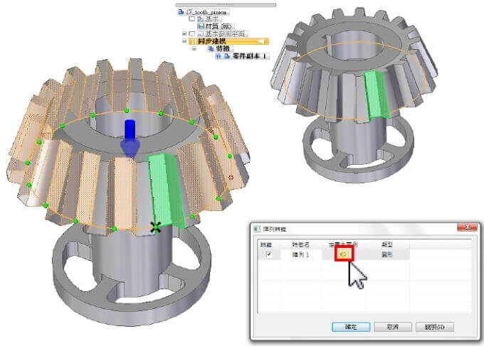 當外來檔的模型轉入Solid Edge後可針對相同的重複幾何進行辯識, 透過系統即可辨識出矩形陣列或圓形陣列,並能重新定義陣列特徵。