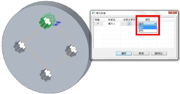 2.修改陣列類型:進行陣列辨識時,當特徵佈局的狀況可同時滿足矩形與圓形陣列時, 對話框中會出現兩種特頪型可做選擇。