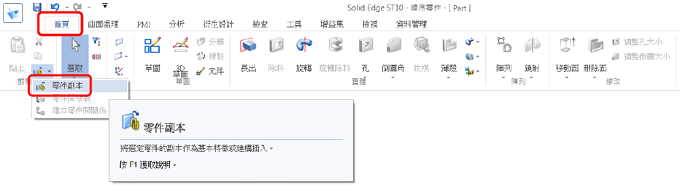 操作步驟: 1.進入零件模組→首頁頁籤→【零件副本】指令。