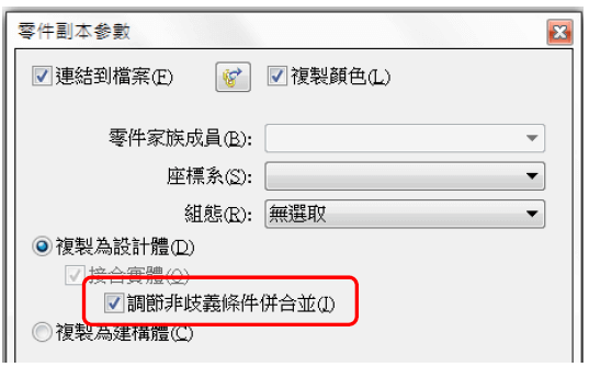 3.零件副本參數→勾選 調節非歧異條件並合併(J)。